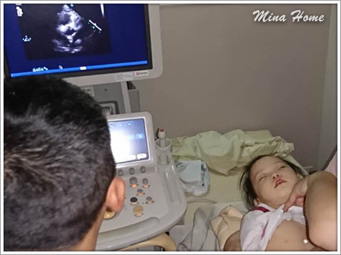 高燒不退除了是泌尿道感染,醫生也擔心是川崎氏症,(川崎氏症是一種全身性血管炎,尤易侵犯心臟冠狀動脈)所以安排了心臟超音波,照之前會先喝鎮定劑讓寶寶睡著,但因為媽咪回家,小妹哭的太厲害把藥都吐出來,所以失敗,等我回醫院抱著小妹睡著,再去照一次,但是那根冰涼的探測棒(不知正確名稱)碰到小妹的胸膛,小妹就醒了,後來護理師只好從肛門灌鎮定劑,這次小妹終於在媽媽的懷裡睡熟了,照的結果沒有腫大,只發現本來應該在左心室的靜脈長到右心室,有百分之三的人是這樣,不影響功能。