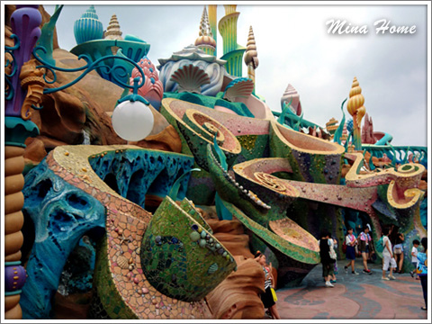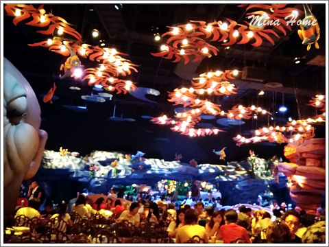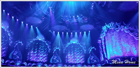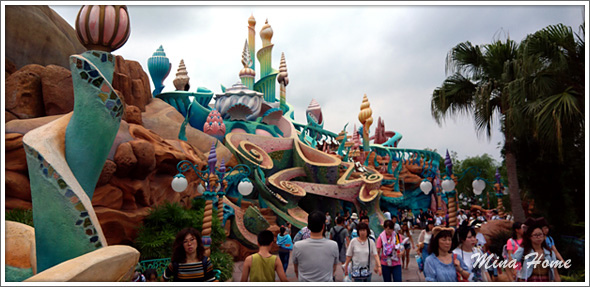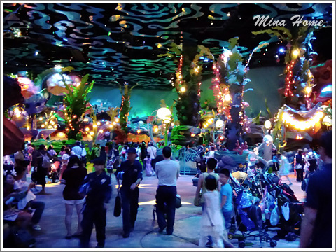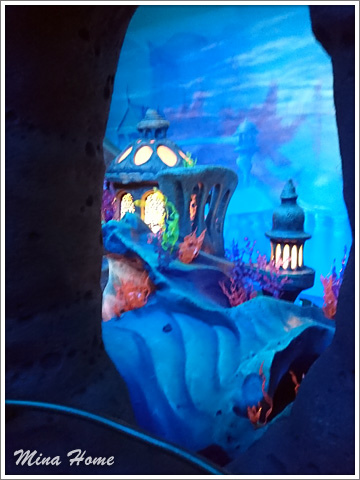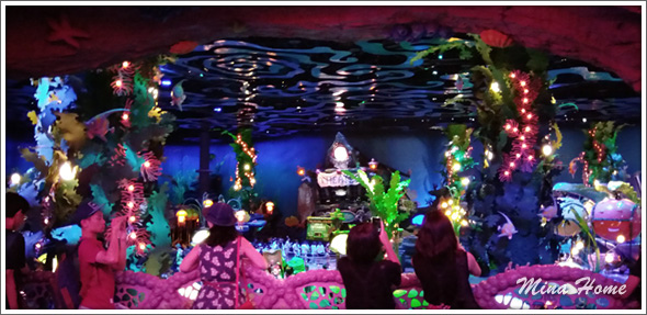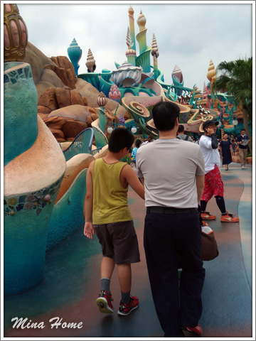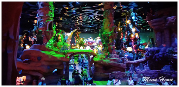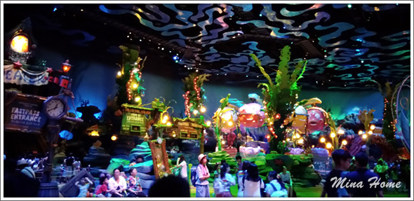 玩過咖啡杯後本來想去排跳躍水母,結果排錯排成美人魚礁湖劇場,還好這是媽咪本來就想看的劇 (吊在半空唱歌表演的美人魚好厲害,腰力超級強)。