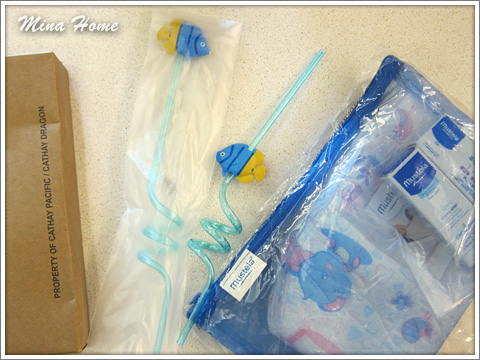 飛機兒童餐附的造型吸管和空姐送的嬰兒用品。